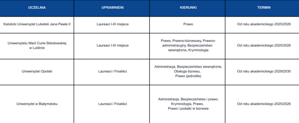 Laureaci Akademii mogą liczyć również na indeks w Uniwersytecie Marii Curie-Skłodowskiej w Lublinie, Uniwersytecie Opolskim, Uniwersytecie w Białymstoku oraz Katolickim Uniwersytecie Lubelskim Jana Pawła II. Procedury uhonorowania laureatów Akademii zwolnieniem z postępowania rekrutacyjnego toczą się również w innych Uniwersytetach.
